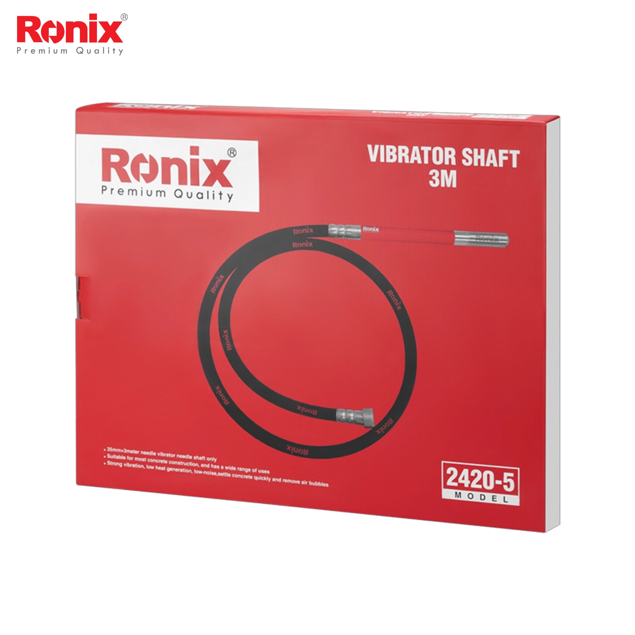 The Ronix 2420-5 features a 3-meter vibrator shaft with a 35mm needle diameter, ideal for reaching deeper and larger concrete pours. With dimensions of 3000mm × 35mm × 35mm and a weight of 6.5kg, it’s the better choice when it comes to heavy-duty and long vertical projects.